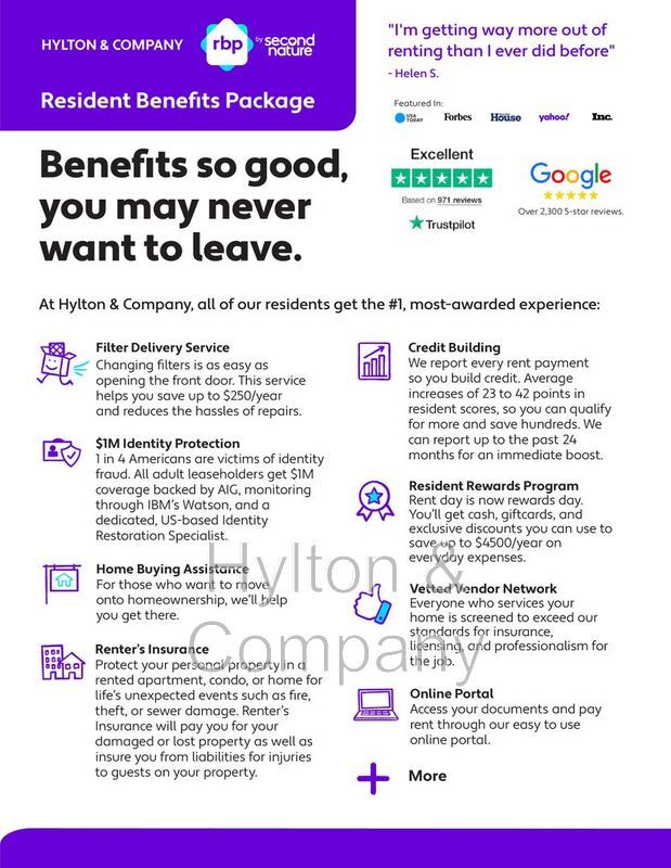Disclosure: All Hylton & Company residents are enrolled in the Resident Benefits Package (RBP) for $50/month which includes HVAC air filter delivery (for applicable properties), credit building to help boost your credit score with timely rent payments, $1M Identity Protection, our best-in-class resident rewards program, renters’ insurance and much more! More details upon application. This fee is already included on the rent.