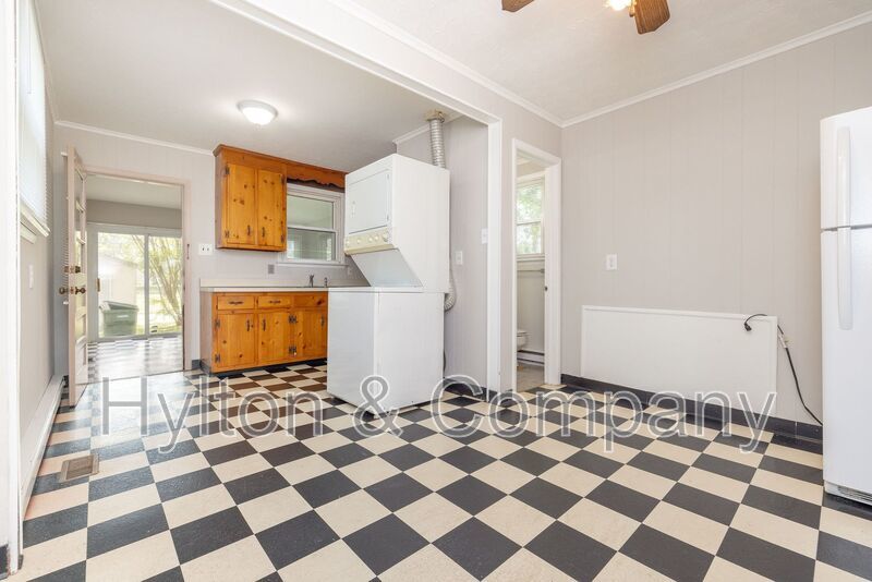 Step inside to find a bright, inviting interior featuring central air/heat, a fully equipped kitchen with a stove and refrigerator, and a spacious dining area—ideal for family meals or entertaining. The convenience continues with a stackable washer/dryer and extra storage in the detached shed.